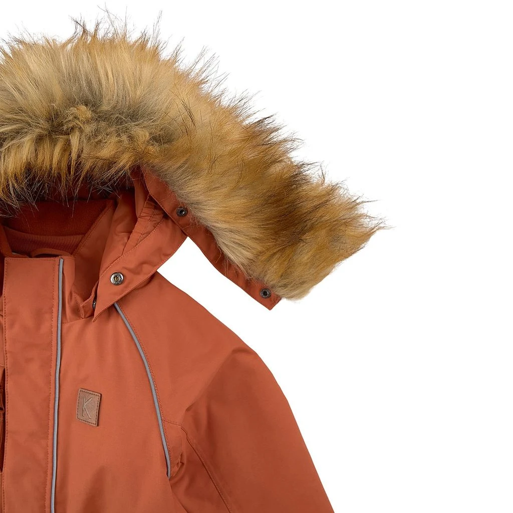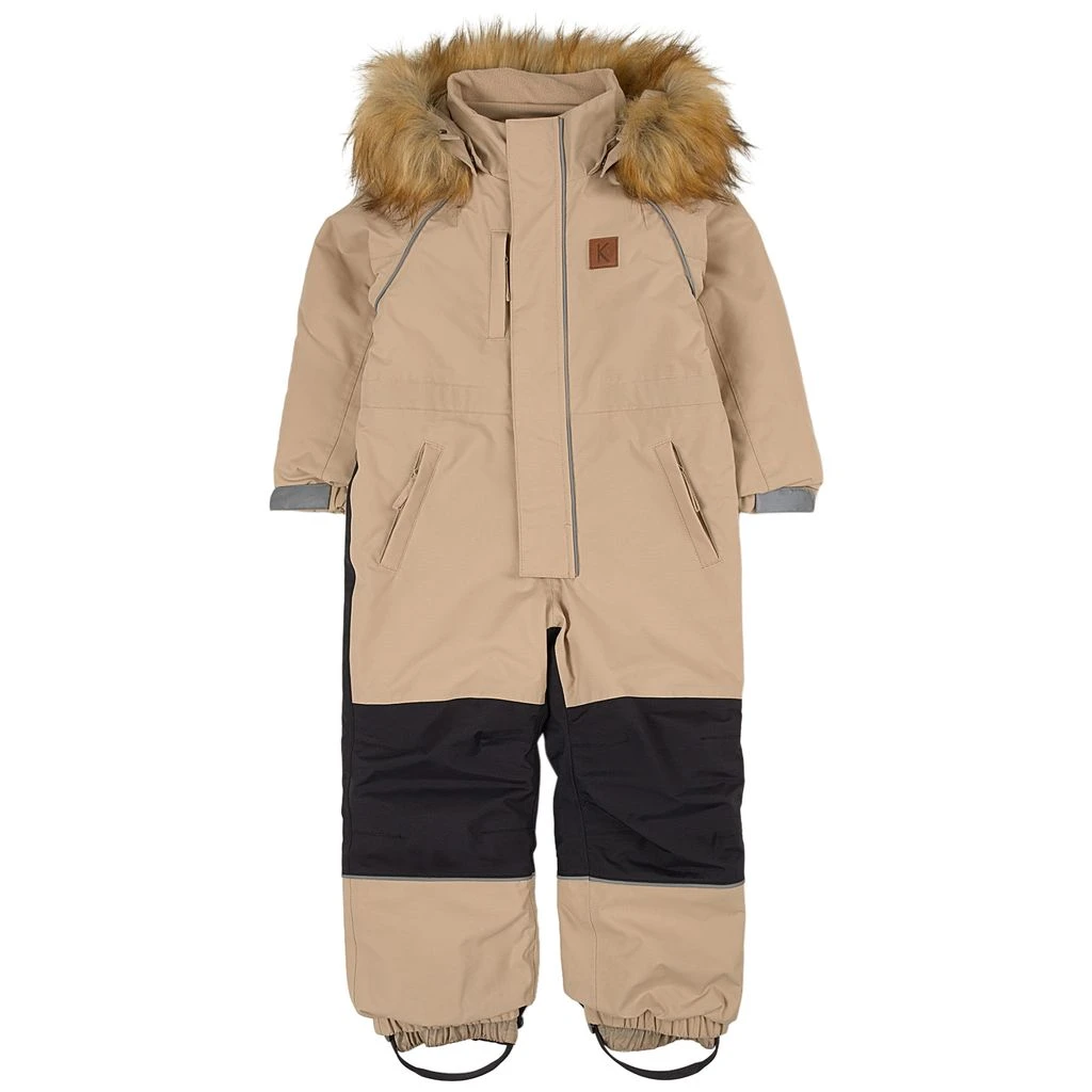 Beige Abisko snowsuit by Kuling. The snowsuit has taped seams. It has warm padding, a detachable hood with detachable faux fur trim, a zip closure at the front, a chest pocket, two front pockets, an adjustable waist, elasticated cuffs, a reinforcement at the seat and at the leg ends, detachable, adjustable silicone foot loops, a snow lock at the leg ends for extra protection and reflective details for visibility.