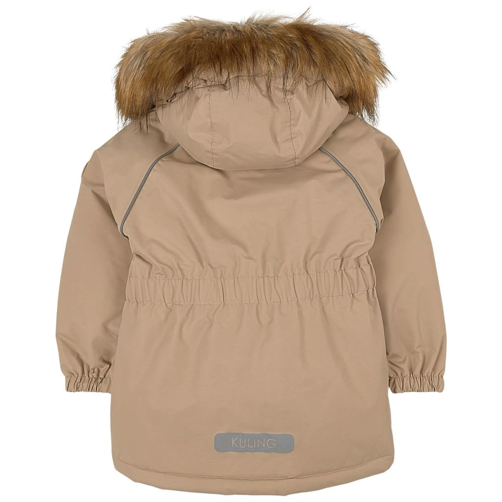 Be warm and comfy on winter adventures. Sand Alberta parka by Kuling. The jacket has taped seams. It has warm padding, a detachable hood with detachable faux fur trim, a zip closure at the front, an adjustable waist, two front pockets, elasticated cuffs and reflective details for visibility.
