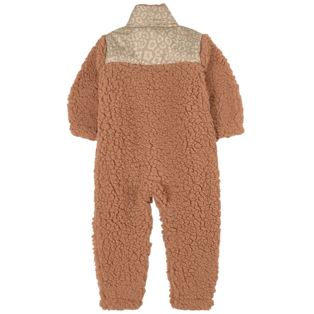 Brown Aosta Teddy coverall by Kuling. The coverall has a soft teddy fleece material. It has snap buttons at the front, elasticated cuffs and two front pockets.