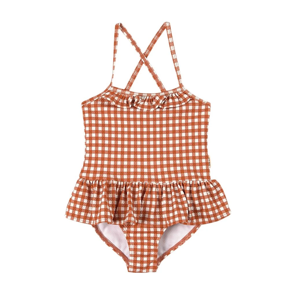 Brown Biarritz swimsuit by Kuling. The swimsuit has a quick-drying, stretchy material. It has criss crossed shoulder straps, a ruffle at the waist and a lined gusset.