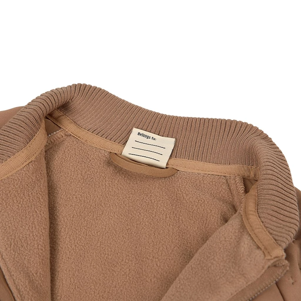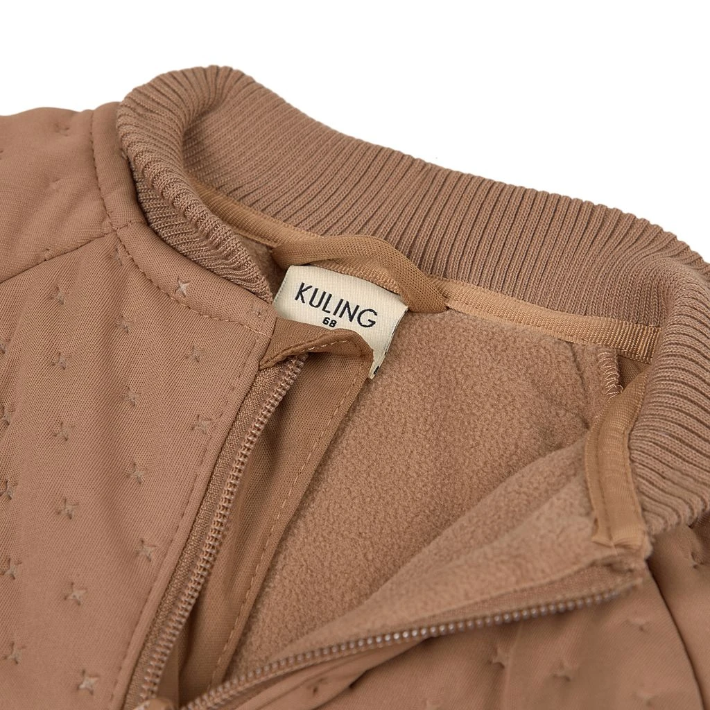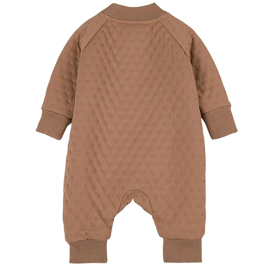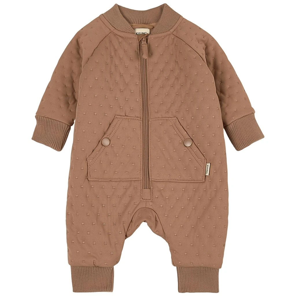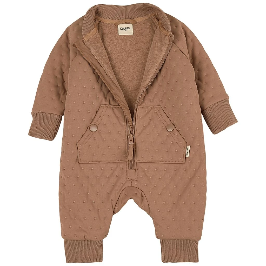 Keep your little baby warm on colder days. Brown Busan coverall by Kuling. The coverall has a quilted design. It has a brushed fleece lining, a zip closure at the front, a split kangaroo pocket and ribbed cuffs.