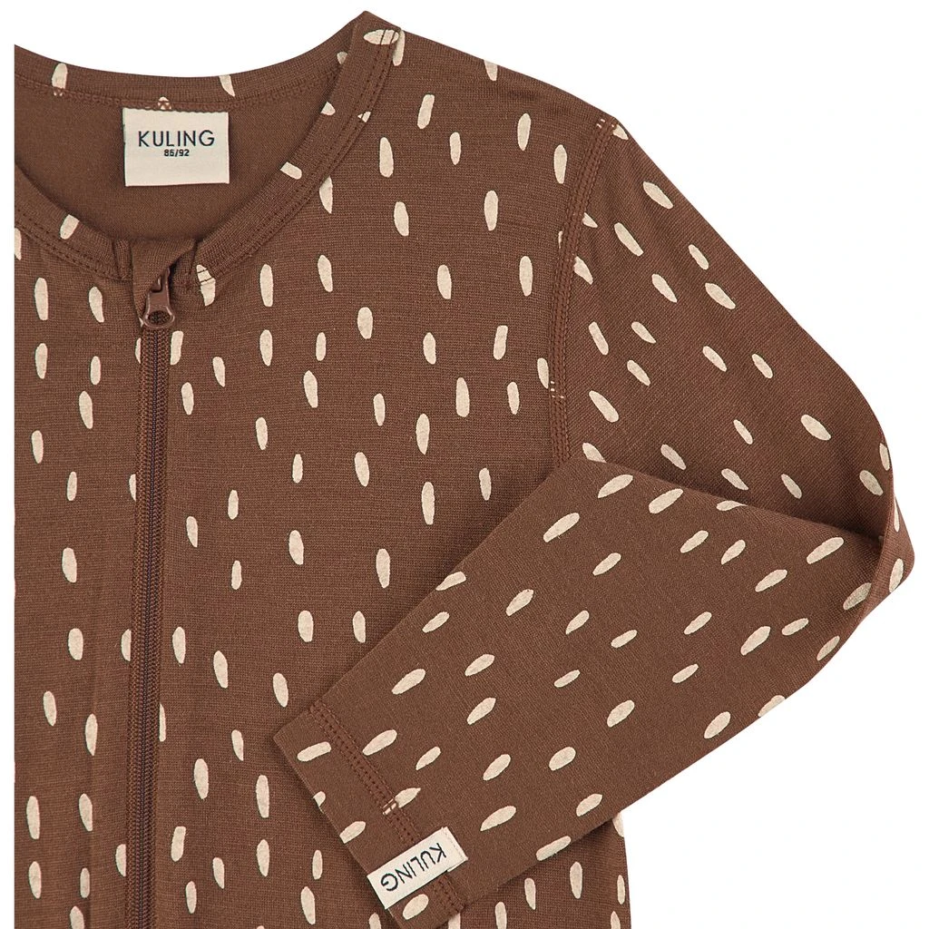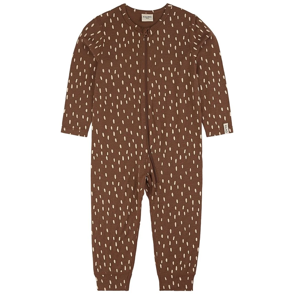 Let your baby explore and play in comfort. Brown one-piece by Kuling. The one-piece has a zip closure at the front.