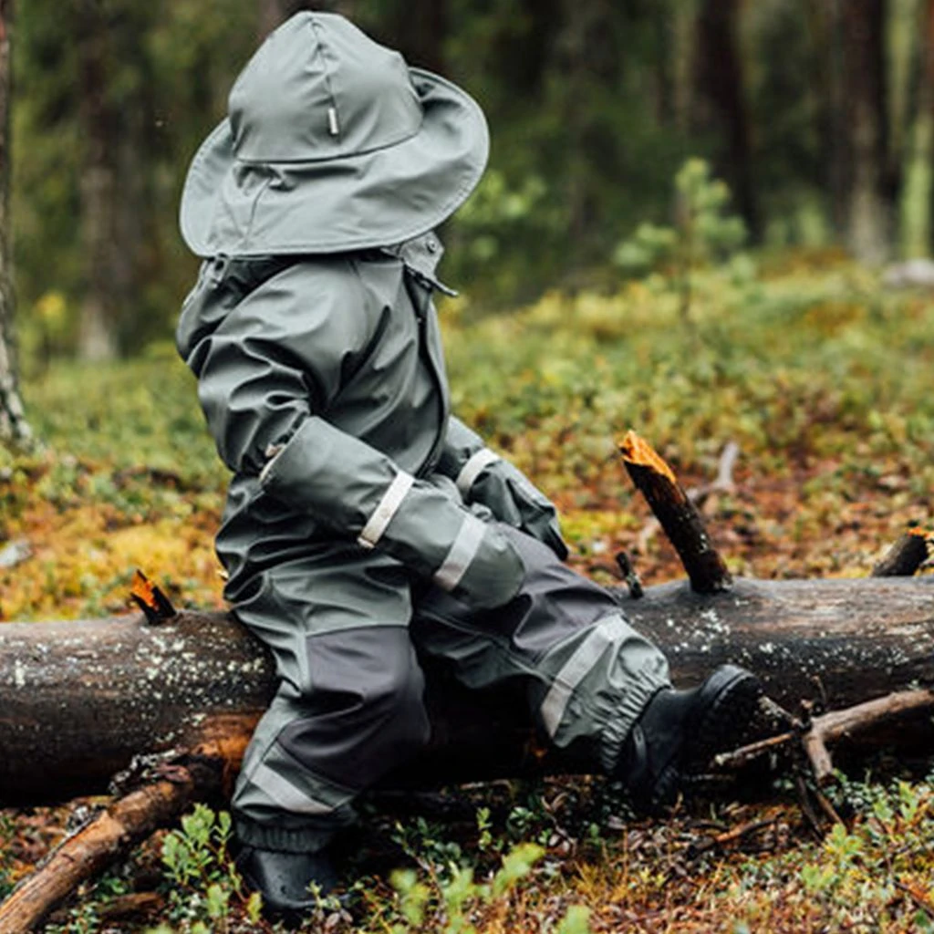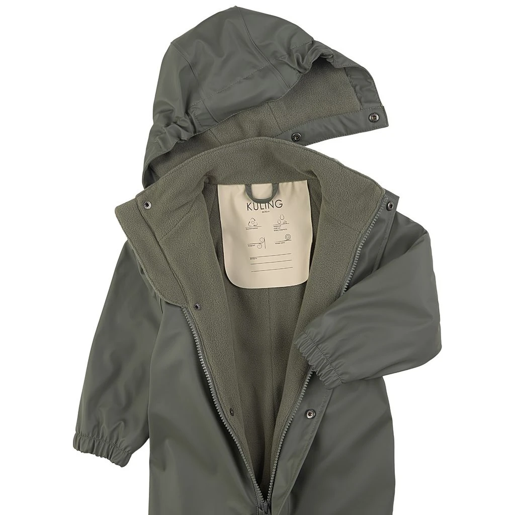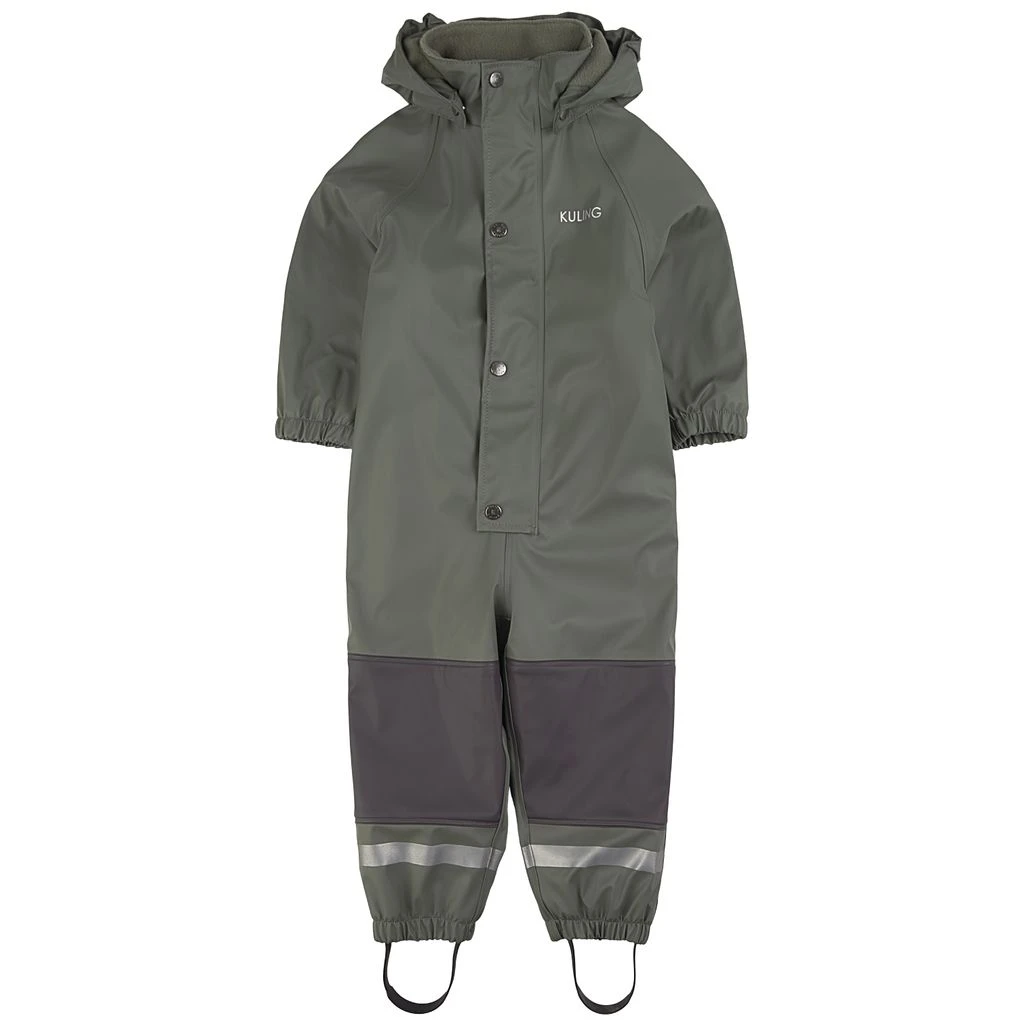 Time to jump through puddles. Green Douglas rain coverall by Kuling. The coverall has welded seams. It has a soft fleece lining, a detachable hood, a zip closure at the front, elasticated cuffs, adjustable, detachable foot loops and reflective details for visibility.