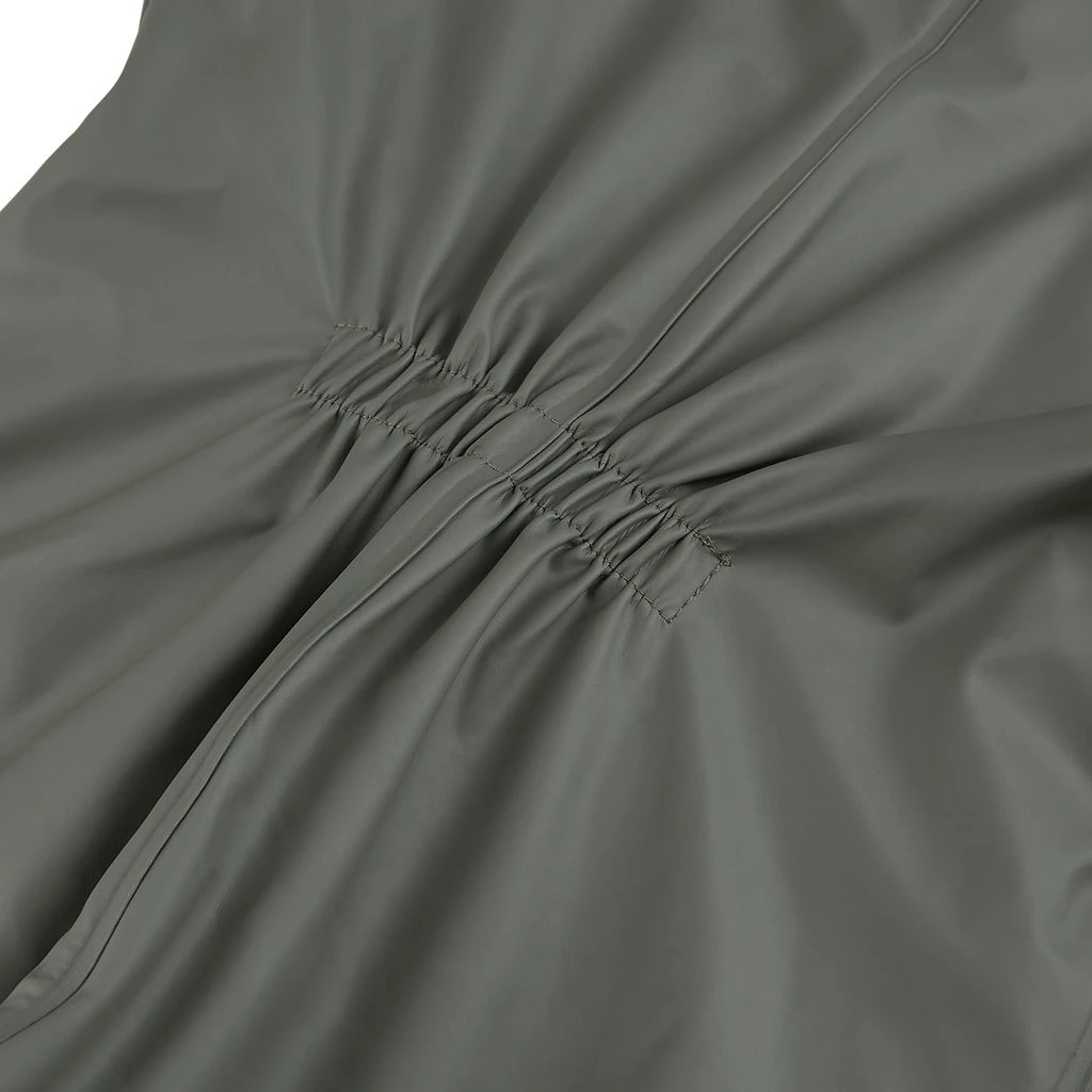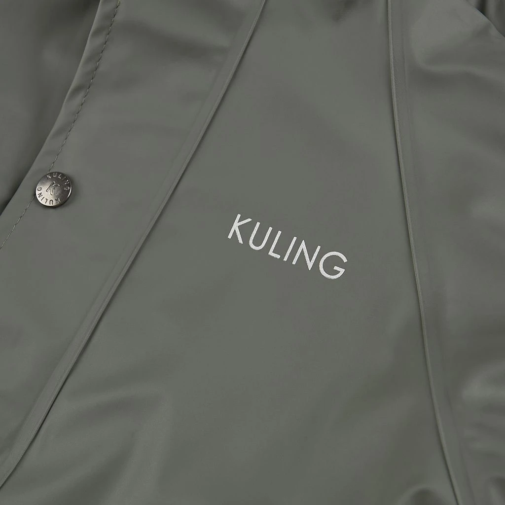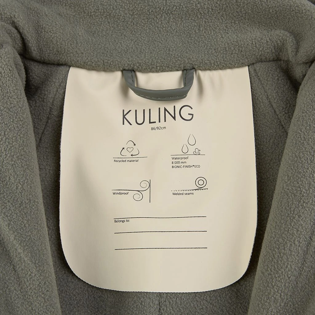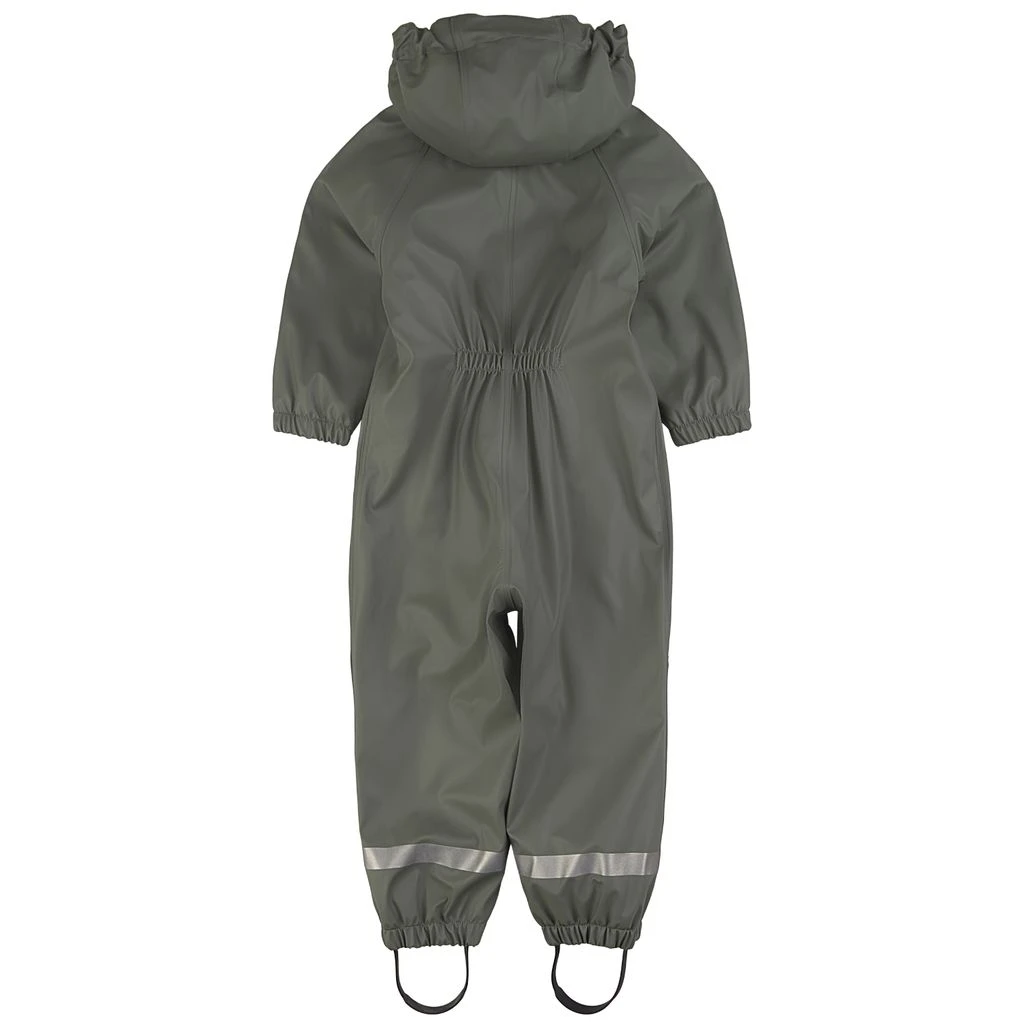 Time to jump through puddles. Green Douglas rain coverall by Kuling. The coverall has welded seams. It has a soft fleece lining, a detachable hood, a zip closure at the front, elasticated cuffs, adjustable, detachable foot loops and reflective details for visibility.