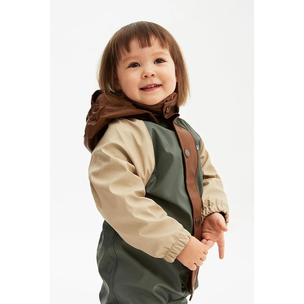 Time to jump through puddles. Edinburgh rain coverall by Kuling. The coverall has welded seams. It has a soft fleece lining, a detachable hood, a zip closure at the front, elasticated cuffs, adjustable, detachable foot loops and reflective details for visibility.