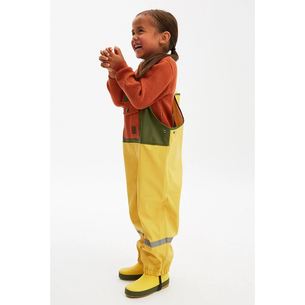 Rainy days won’t stand a chance. Yellow Edinburgh rain trousers by Kuling. The trousers have welded seams. They have elasticated, adjustable shoulder straps, one front pocket, elasticated cuffs, adjustable silicone foot loops and reflective details for visibility.