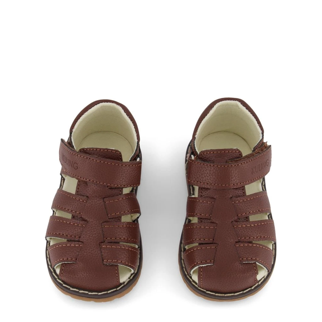 Brown Falkenberg sandals by Kuling. The sandals have a faux leather upper. They have closed toe, a velcro closure for easy on and off, a cushioned insole and a non-slip sole.
