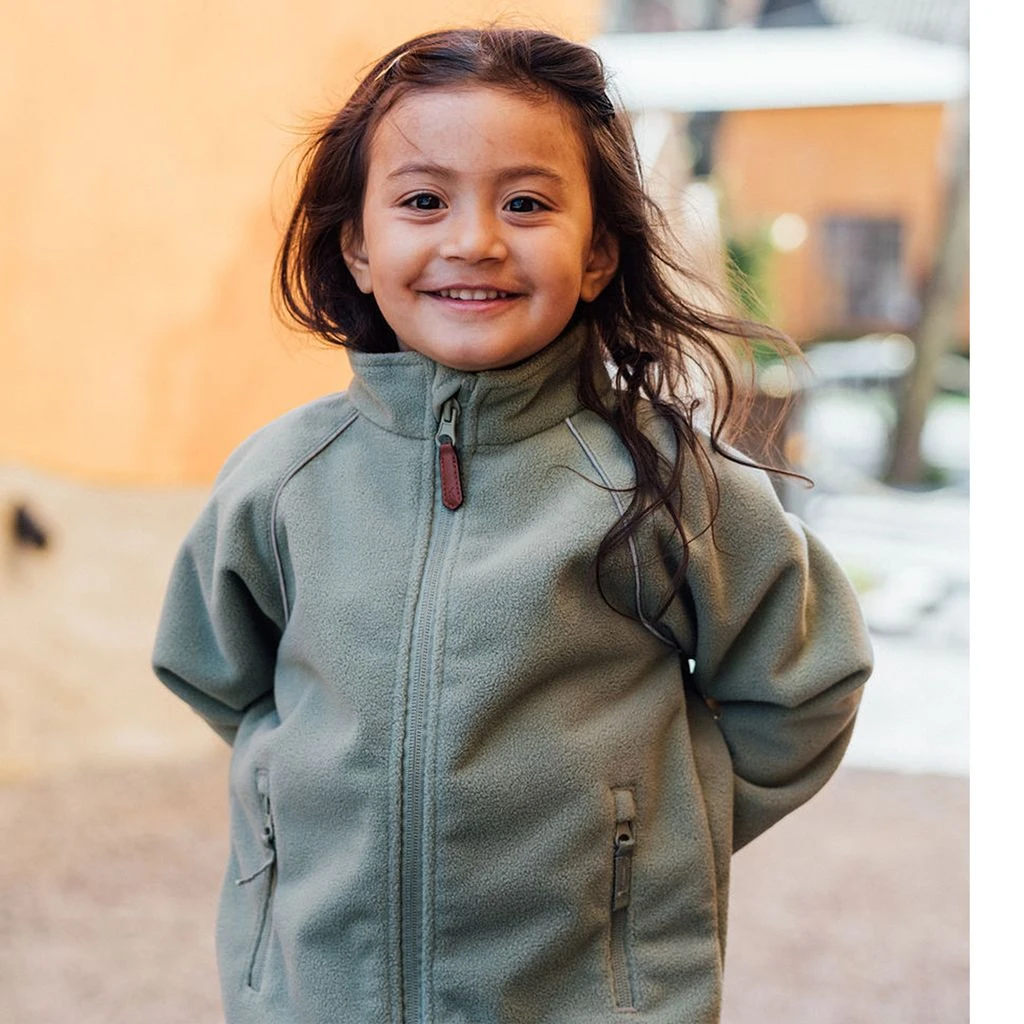 Moss green Livigno wind fleece jacket by Kuling. The wind fleece jacket has a zip closure at the front. It has two front pockets, ribbed cuffs with thumbholes and reflective details for visibility.