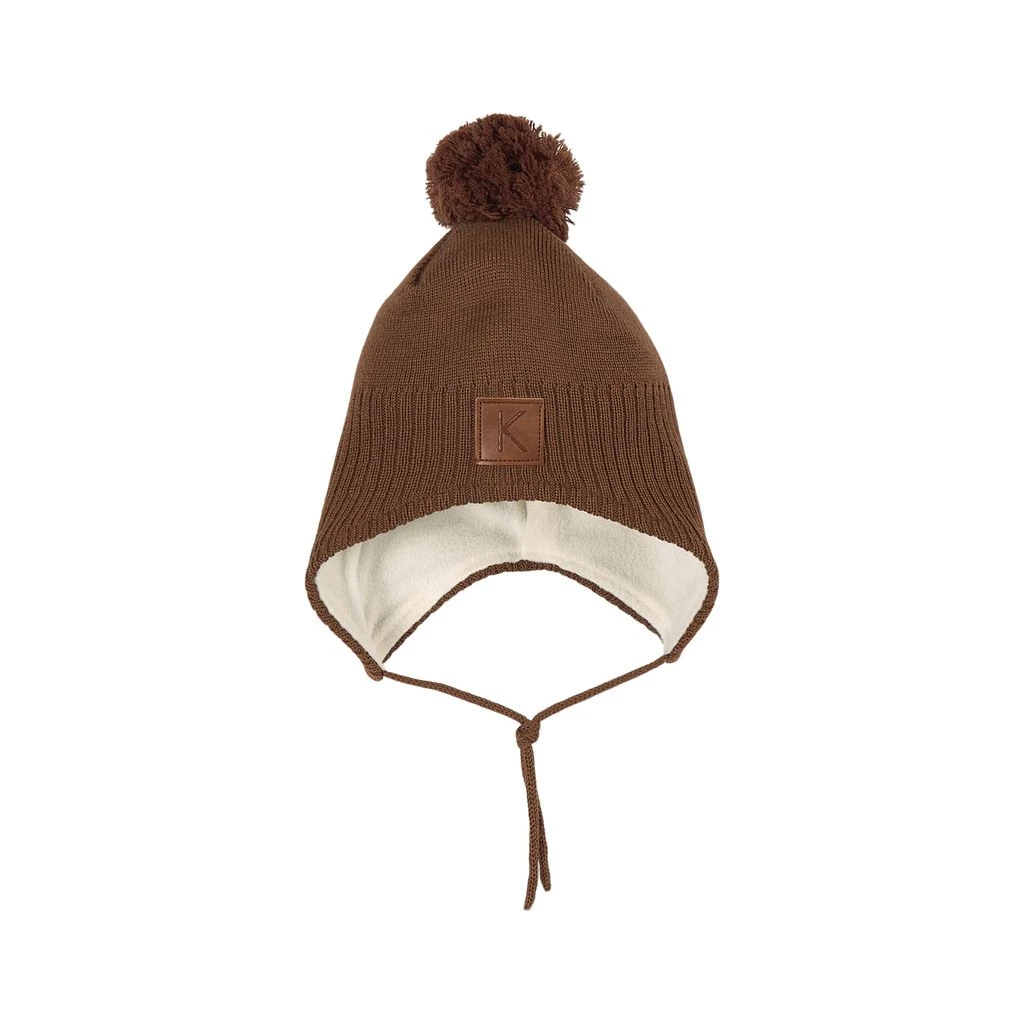 Keep little ears warm in style. Brown Narvik beanie by Kuling. The hat has a knitted design. It has a double, soft fleece lining, a pom-pom at the top, ear flaps and tie strings at the chin.