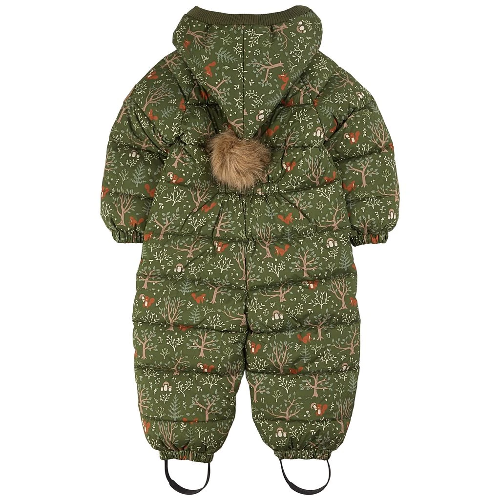 Get ready for outdoor adventures. Green New Haven baby coverall by Kuling. The baby coverall has warm padding. It has a detachable hood with a faux fur pom-pom, a double zip closure at the front, a chest pocket, elasticated cuffs, adjustable, detachable silicone foot loops and a reflective detail for visibility.