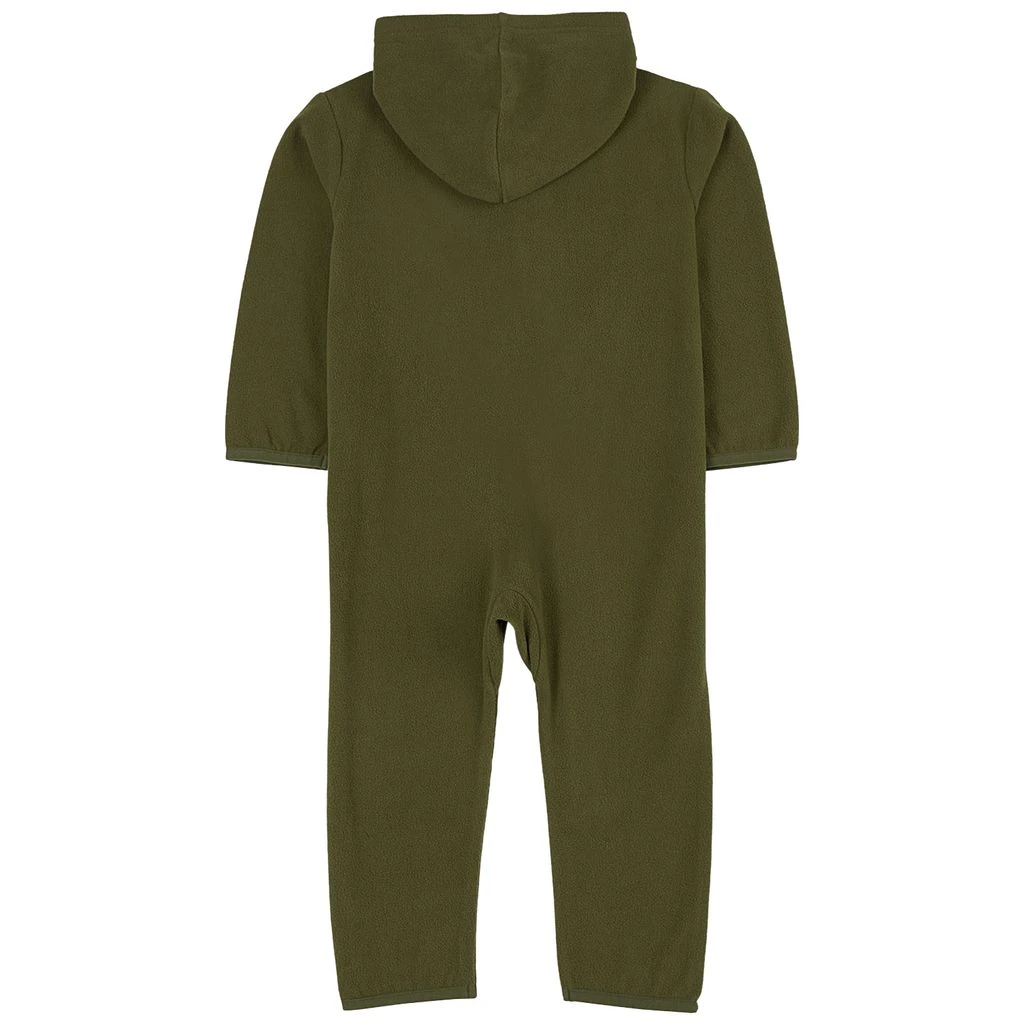 Keep warm with comfy fleece. Moss green Northpole fleece onesie by Kuling. The fleece onesie has a fixed hood. It has a zip closure at the front.