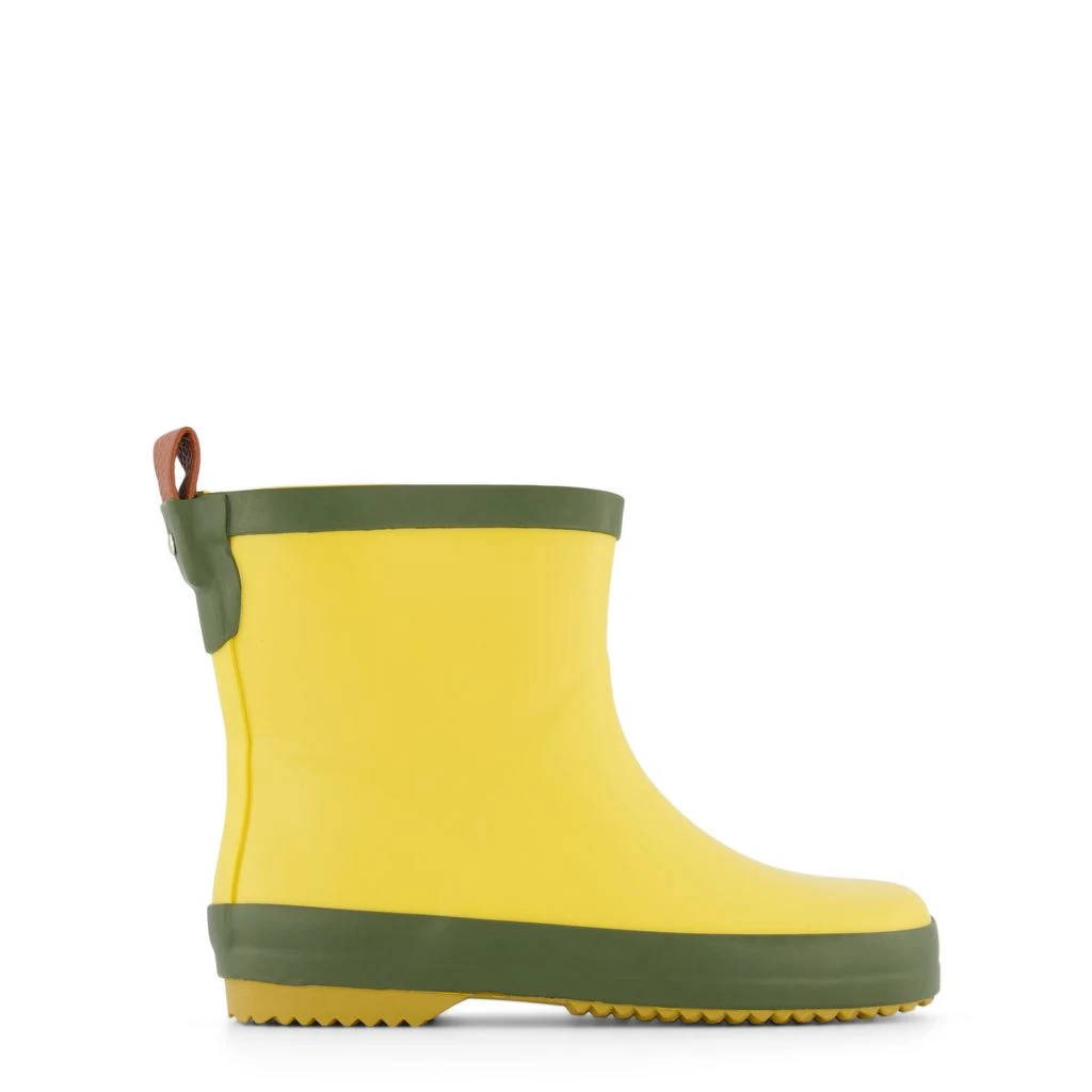 Keep little feet dry with these comfortable and waterproof boots. Yellow, green Oslo rain boots by Kuling. The boots have an ankle high design. They have a rubber upper, a bonded lining and a non-slip sole.