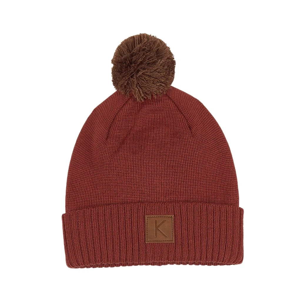 Keep little ears warm in style. Burgundy St Moritz beanie by Kuling. The hat has a knitted design. It has double layers, a pom-pom at the top and a folded hem.