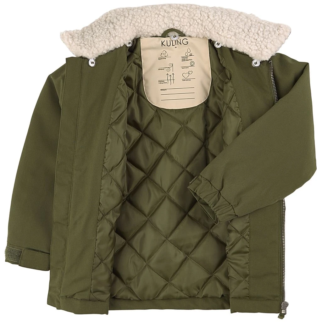 Green Vancouver shell jacket by Kuling. The jacket has taped seams. It has quilted padding, a teddy fleece collar, a zip closure at the front, two front pockets, adjustable cuffs and reflective details for visibility.