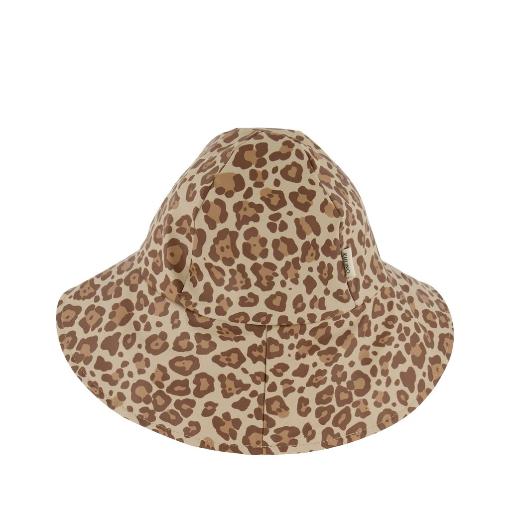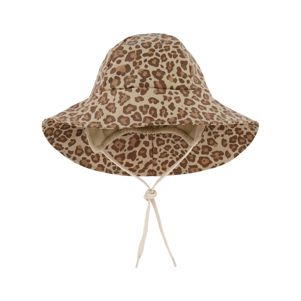 Brown Vasa rain hat by Kuling. The rain hat has welded seams. It has an asymmetrical brim, fleece lined ear flaps and tie straps at the chin.