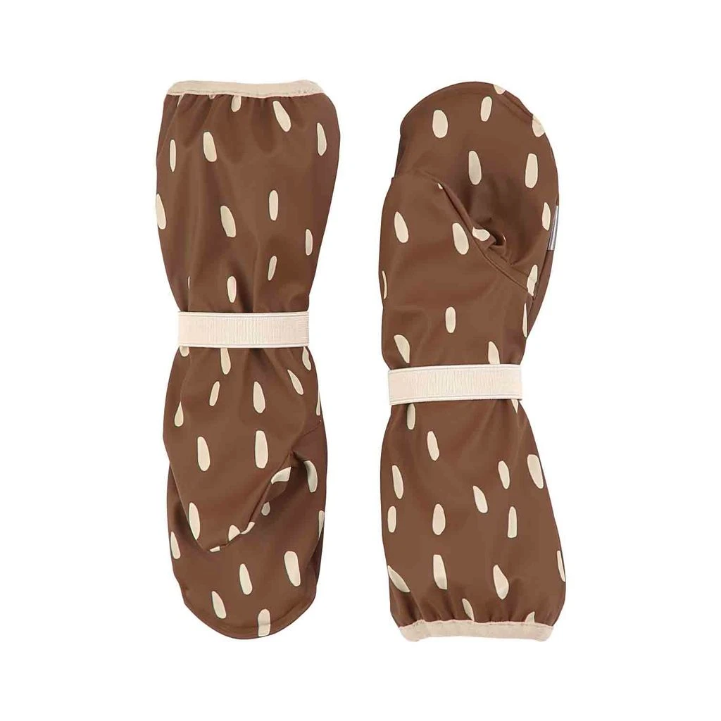 Rainy days will be so much fun. Brown Vilnius rain mittens by Kuling. The rain mittens have welded seams. They have a soft fleece lining, an elasticated strap with snap button at the wrist, elasticated cuffs and reflective details for visibility.