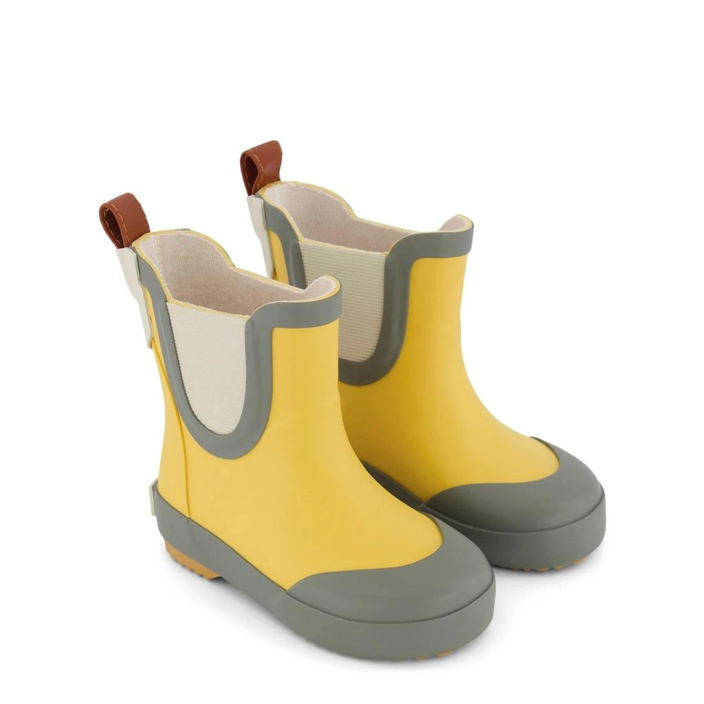 Time to jump through puddles. Yellow Wells rain boots by Kuling. The boots have welded seams. They have a rubber upper, a bonded lining, a pull tab at the back, removable insoles and a non-slip sole.