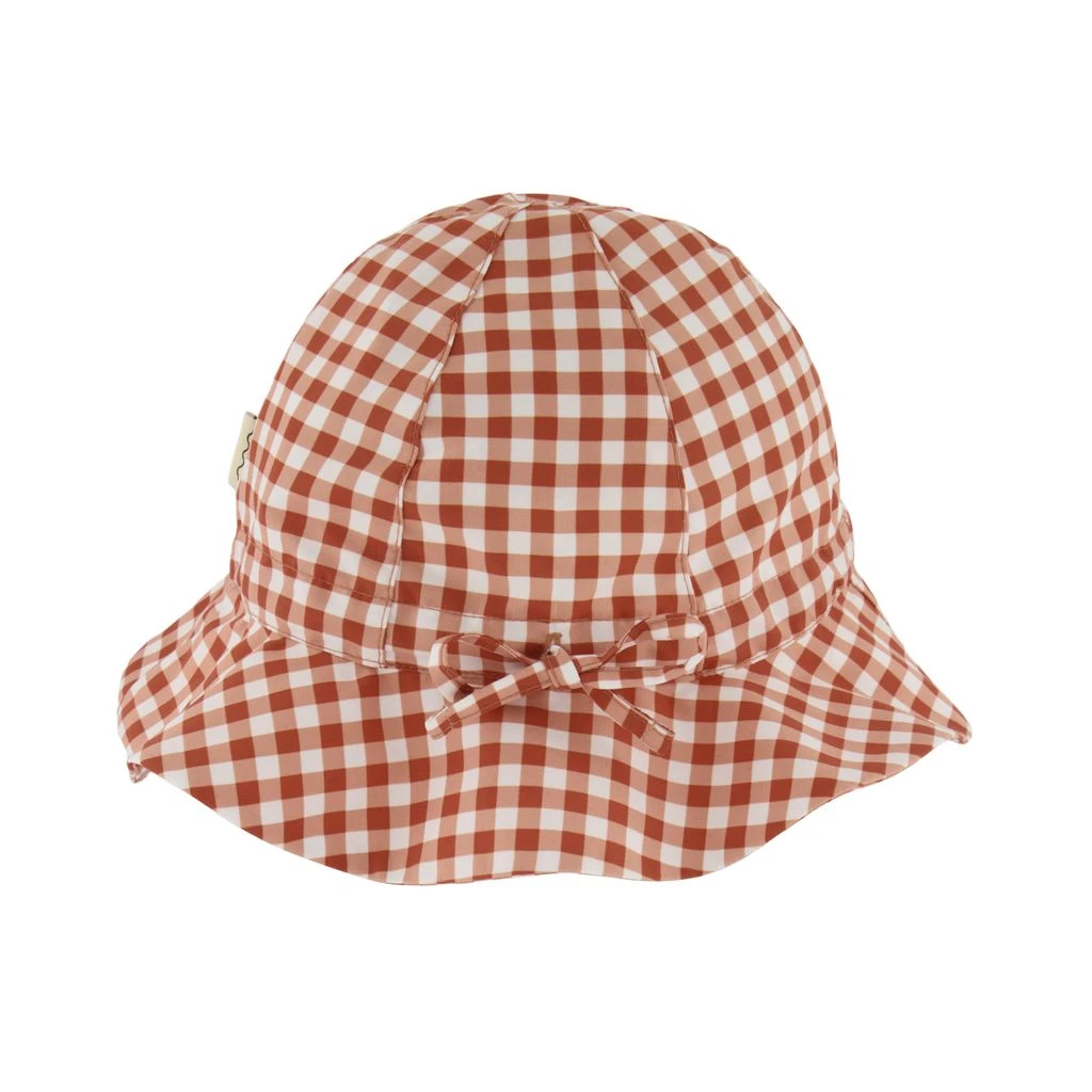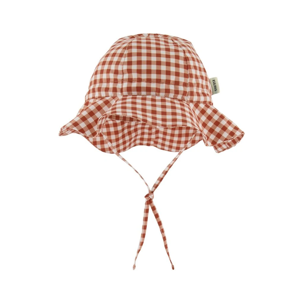 Woven sun hat by Kuling. The sun hat has a soft brim. It has tie strings at the chin.