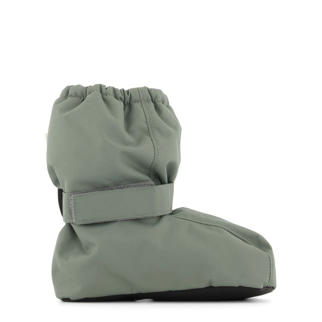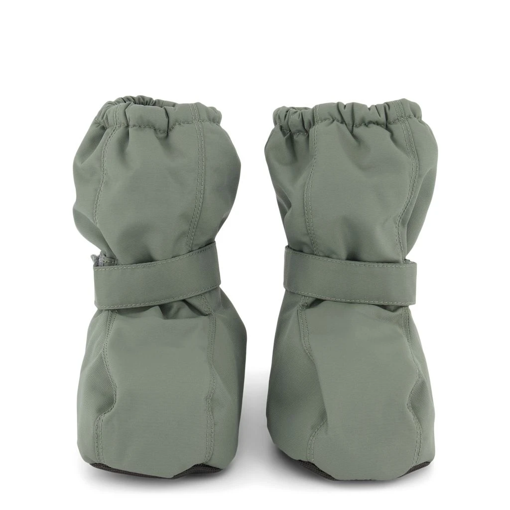 Keep little feet warm. Green Yellowstone booties by Kuling. The booties have taped seams. They have a soft fleece lining, elasticated cuffs, a velcro closure at the ankle and soles with non-slip details.