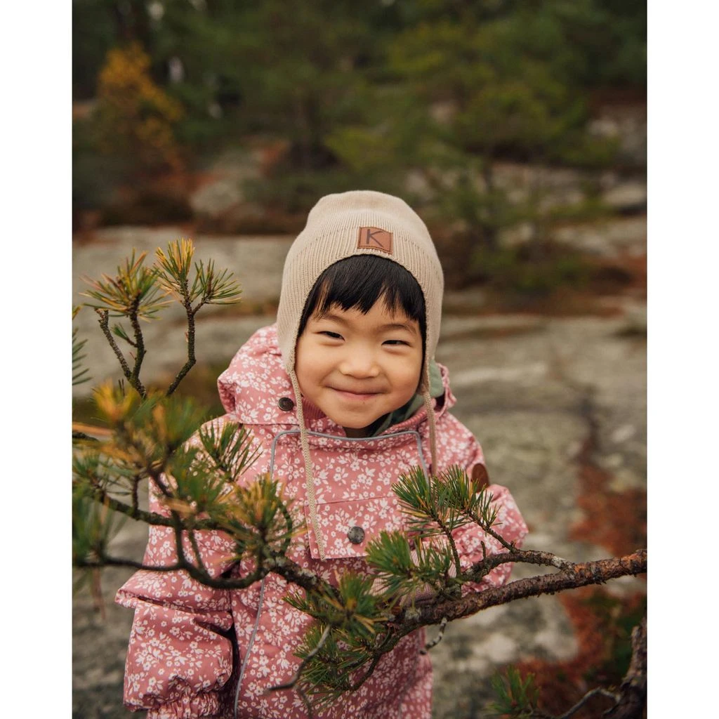 Keep little heads warm. Beige Zakopane hat by Kuling. The hat has a knitted design. It has ear flaps and tie strings at the chin.